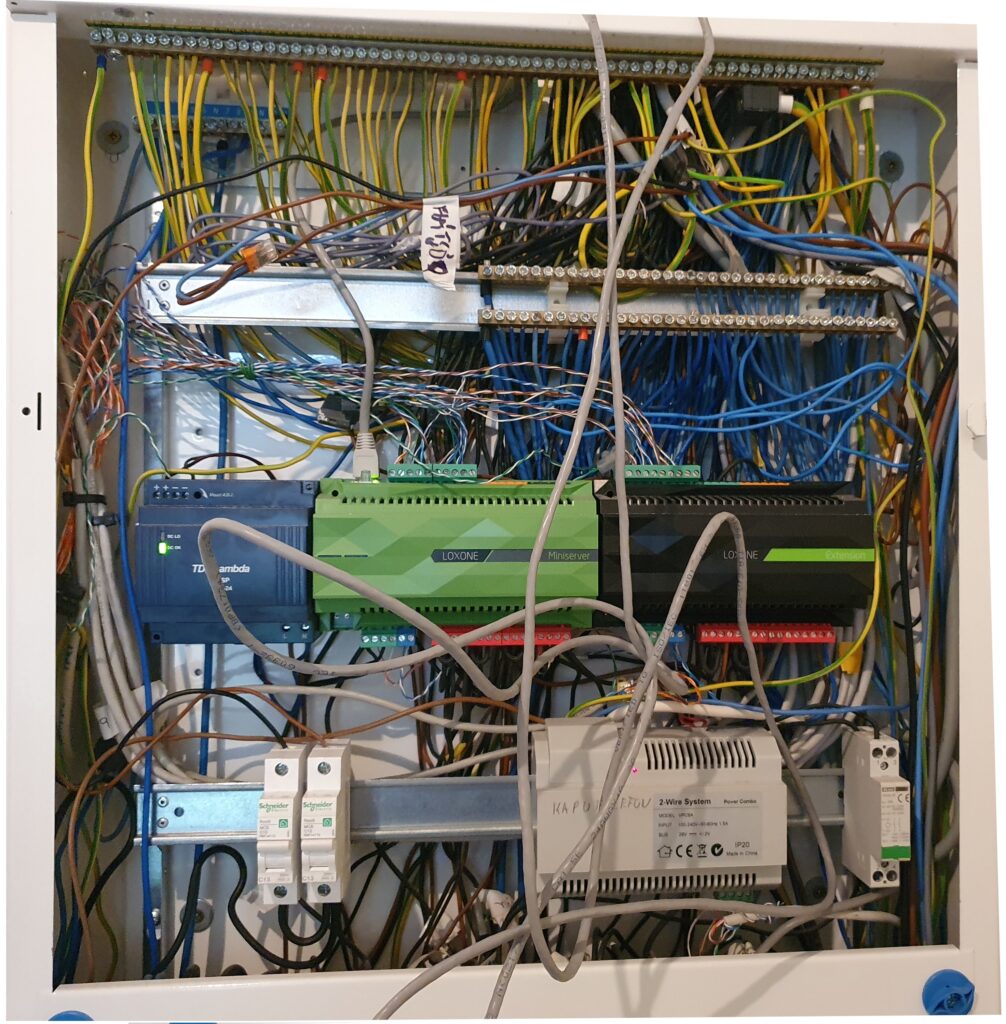 Ez egy icipici Loxone rendszer. Tipikus példája annak, amikor a sorkapocsnak sajnálják a helyet, mert hogy alig pár ki-be menet szóval átlátjuk ezt… Mondjuk attól még lehetne igényesebben elvezetni a kábeleket. Nem kellene ráhagyni 20-30 centi felesleget.