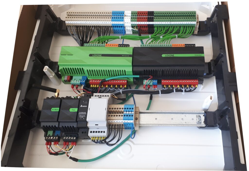 Amúgy sokszor azért is néz ki olyan csúnyán egy Loxone szekrény, mert nem veszik a fáradtságot, hogy műhelyben összerakják, hanem a helyszínen csinálják meg. Ilyenkor a legnagyobb gondosság mellett se mindig jó az eredmény.